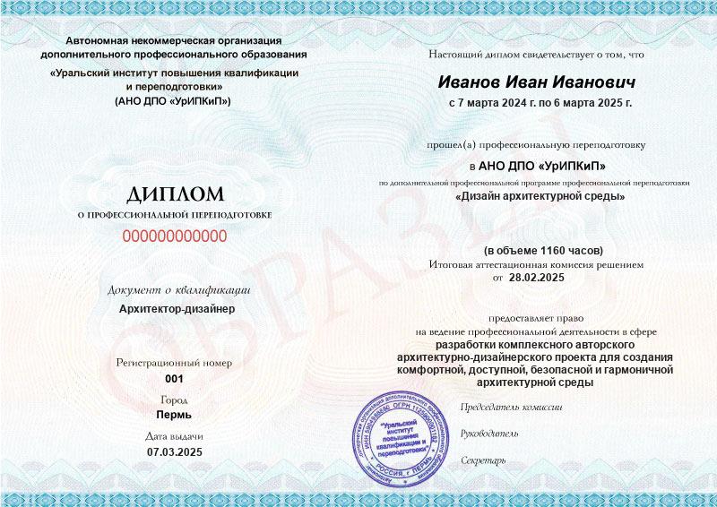 - Диплом о профессиональной переподготовке АНО ДПО «НАРХСИ» с присвоением квалификации «Архитектор-дизайнер».