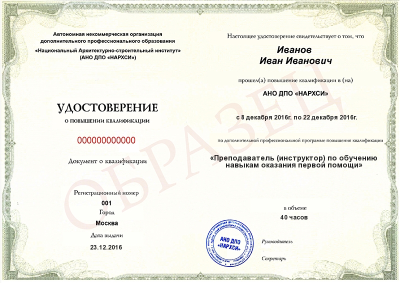 Удостоверение о повышении квалификации Подтверждает, что вы прошли обучение по программе «Преподаватель (инструктор) по обучению навыкам оказания первой помощи» в АНО ДПО «НАРХСИ». Действует на всей территории РФ.
