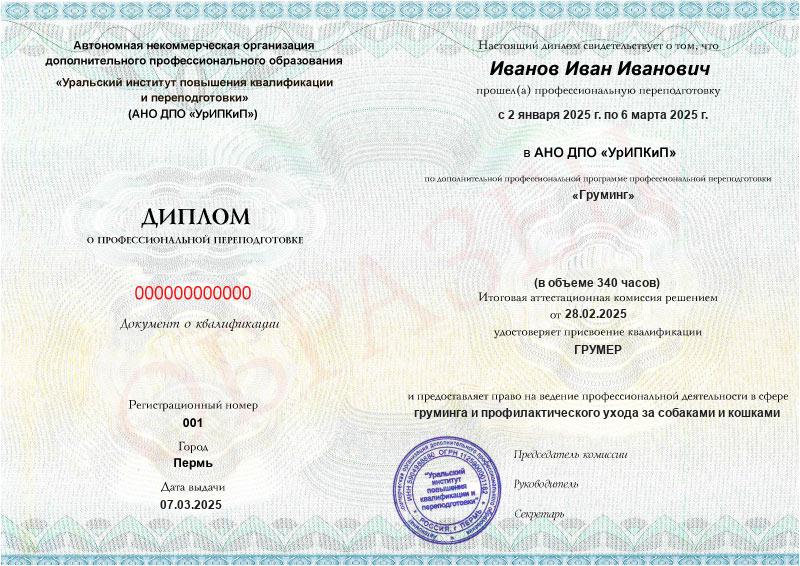 - Диплом о профессиональной переподготовке или сертификат о прохождении дополнительной образовательной программы «Грумер».